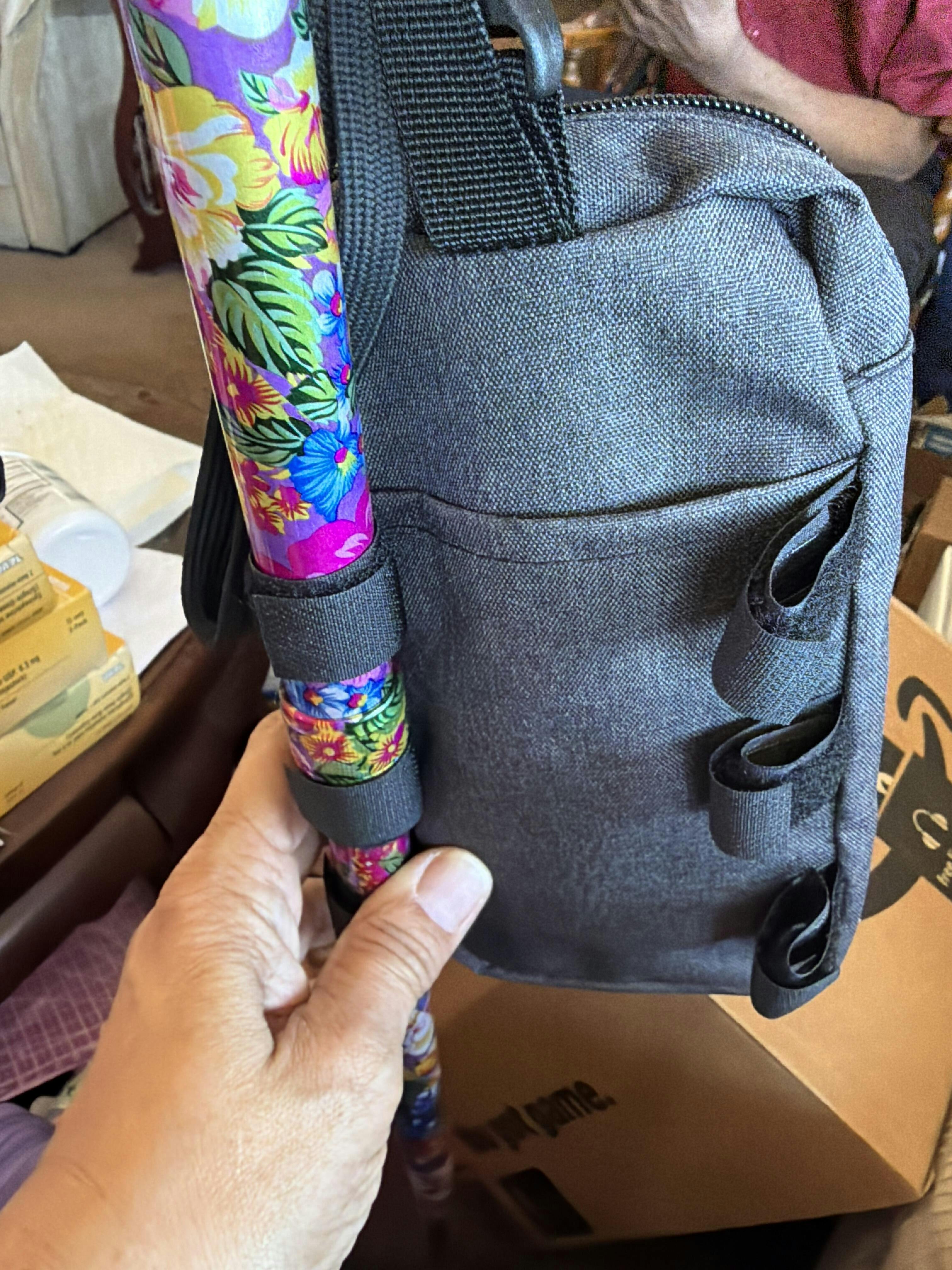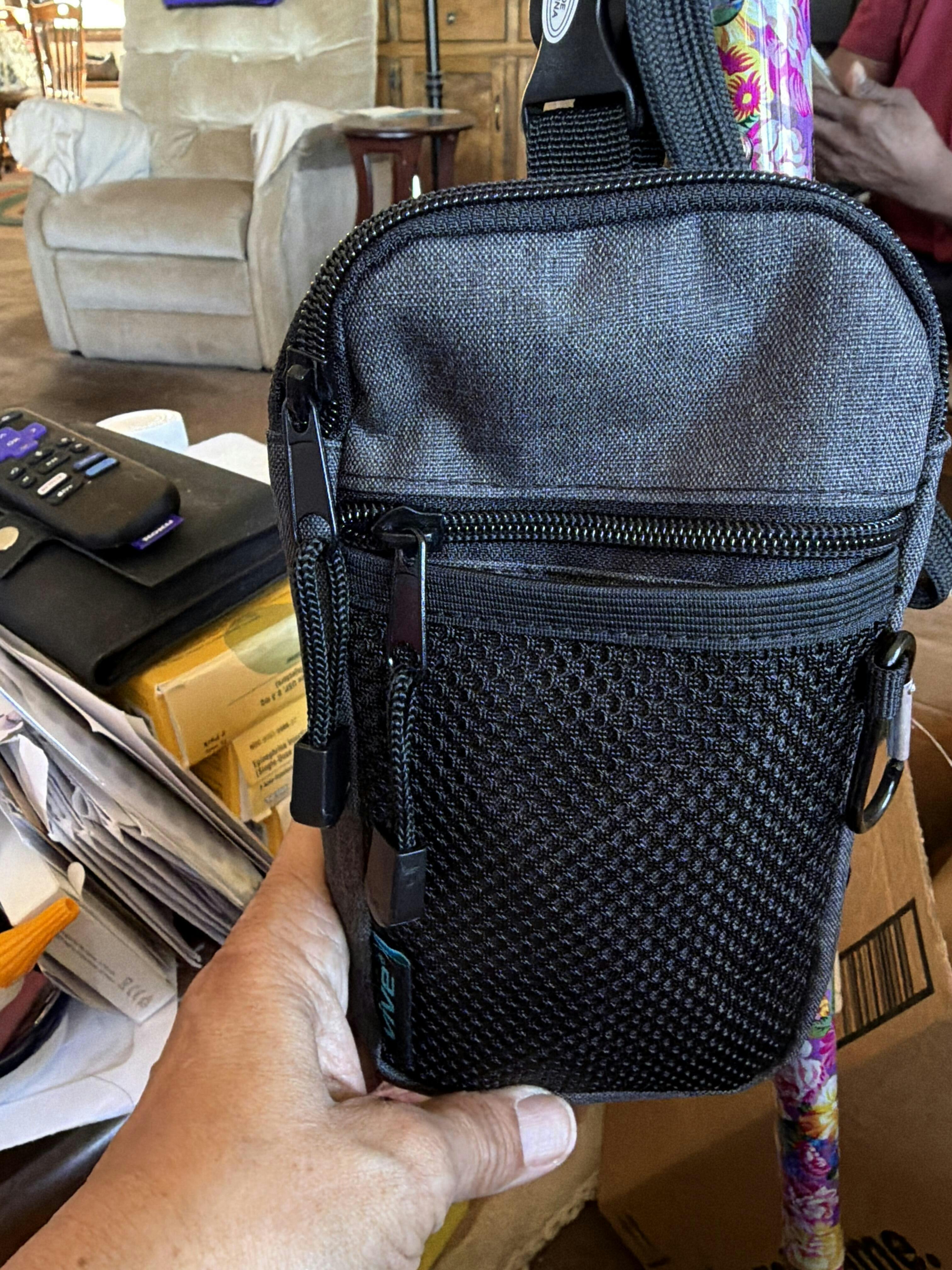 The bag features a non-slip hook and flexible loop straps that allow for easy and secure attachment to a cane or forearm crutches. The straps are also adjustable, for a personalized fit.