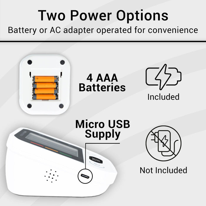 The monitor is powered by 4 AAA batteries, which are included in the package, so you can start using it right away.