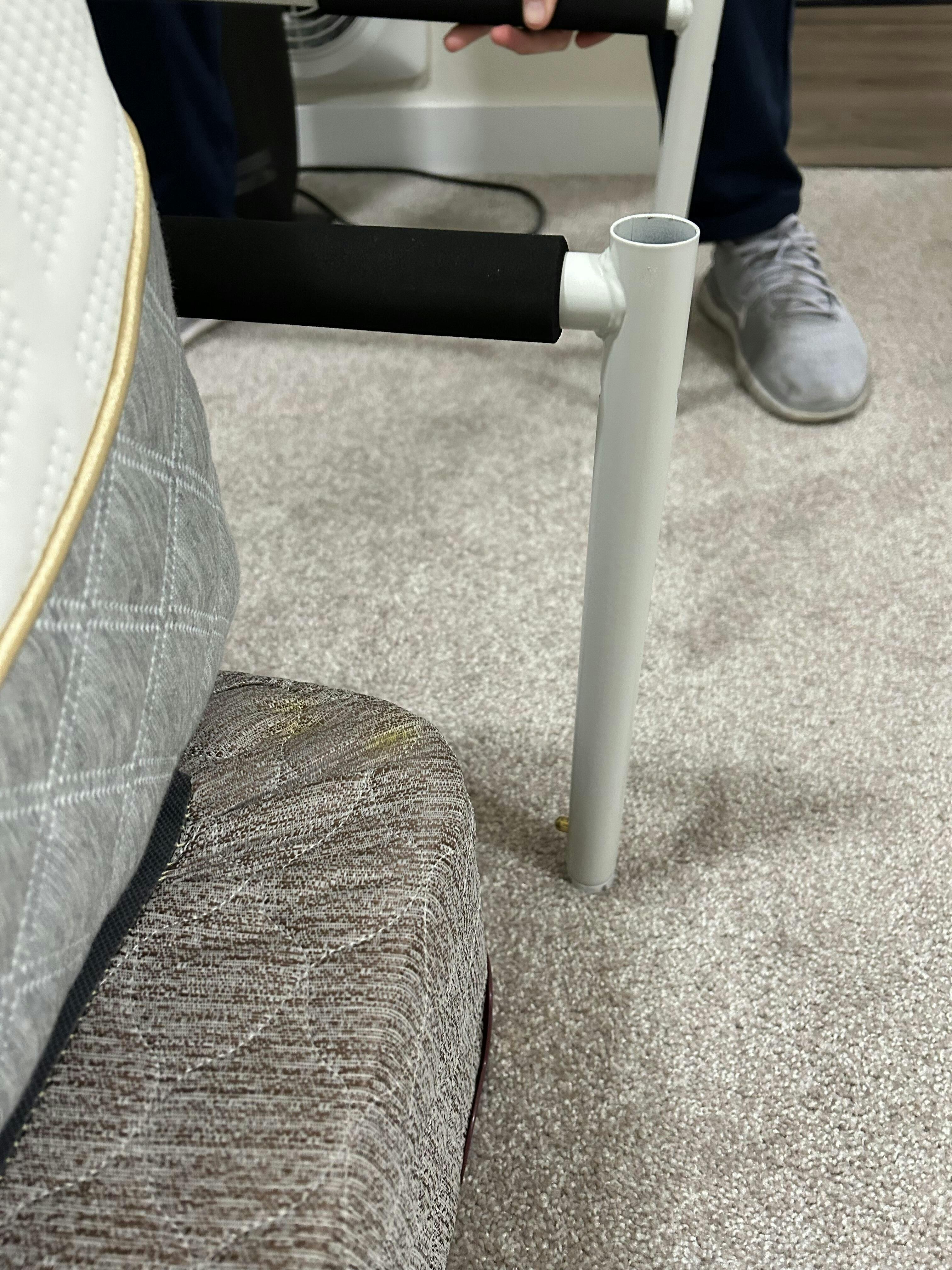 With pins facing outward insert the L-shaped base frames into the U-shaped base frame until you hear an audible click. Length can then be adjusted with the locking pins for the correct depth for your mattress size. Remove the lock pin collar tabs from the base frame. Adjust the support hand frame to your desired height and lock in the pin collar tabs. Attach leg extensions by depressing the locking pins and sliding into place. Lift up the mattress and slide the base frame onto the box springs. The frame will rest between the mattress and box springs. Adjust the leg extensions to rest securely on the floor. Leg position is secure when you hear an audible click.