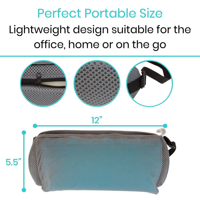 The Vive ice lumbar roll is constructed with a high-density, polyurethane foam, a mesh fabric blend and elastic. The lumbar roll also includes two Arctic Flex gel packs that provide hot or cold therapy for maximum pain relief.