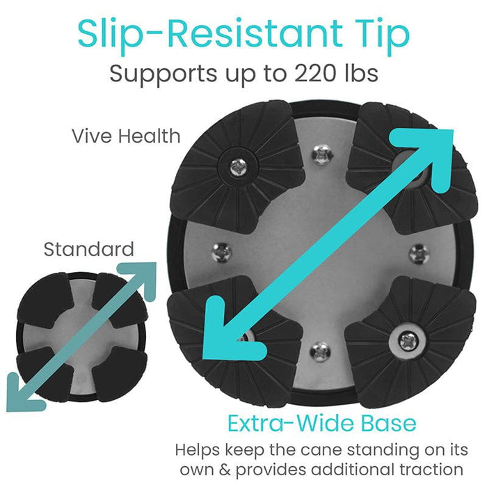 Textured for greater traction, the standing cane tip features four pads that flex and swivel for safe use on all surface types including pavement and hardwood floors as well as grass, gravel and plush carpeting