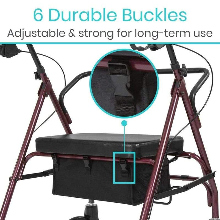 The rollator seat bag features six adjustable buckle straps for easily attaching to the front and rear bars of the rollator.