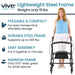 The Vive Mobility Core Rollator weighs only 19 pounds, making it lightweight and easy to handle while maintaining its durability and strength.