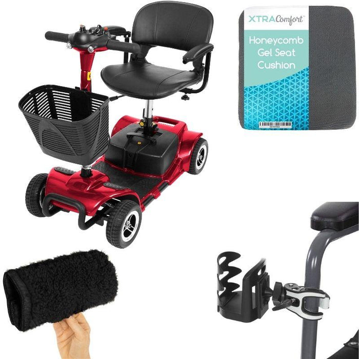 • 4 Wheel Mobility Scooter: a powered mobile wheelchair device for adults. Folding, collapsible, and compact for travel. Long range power extended battery with charger and basket included.