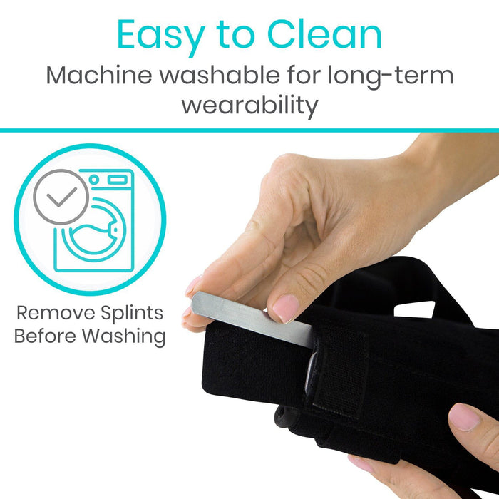 Yes! To clean your brace, first, remove the metal splints, then hand wash in cold water with a mild detergent and allow to air dry.