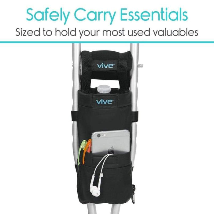 The Vive crutch bag is water-resistant, keeping content safe and dry from splashes and spills and light precipitation. The crutch bag is not waterproof.