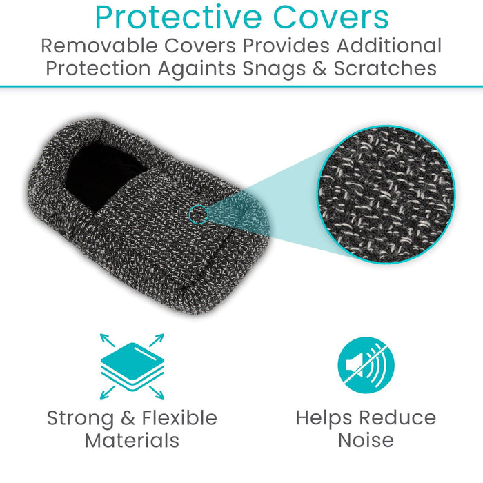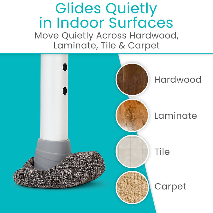 These walker ski glide covers are made for indoor use on hardwood, tile, laminate, and carpeted surfaces. They help your walker move quietly and smoothly without damaging your floors.