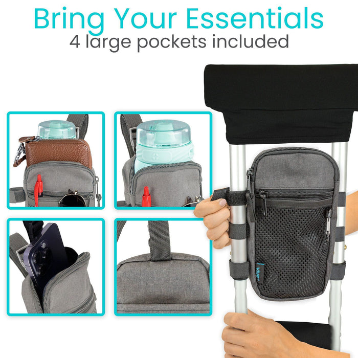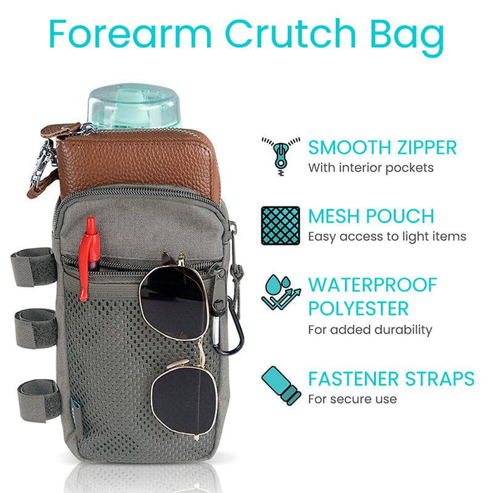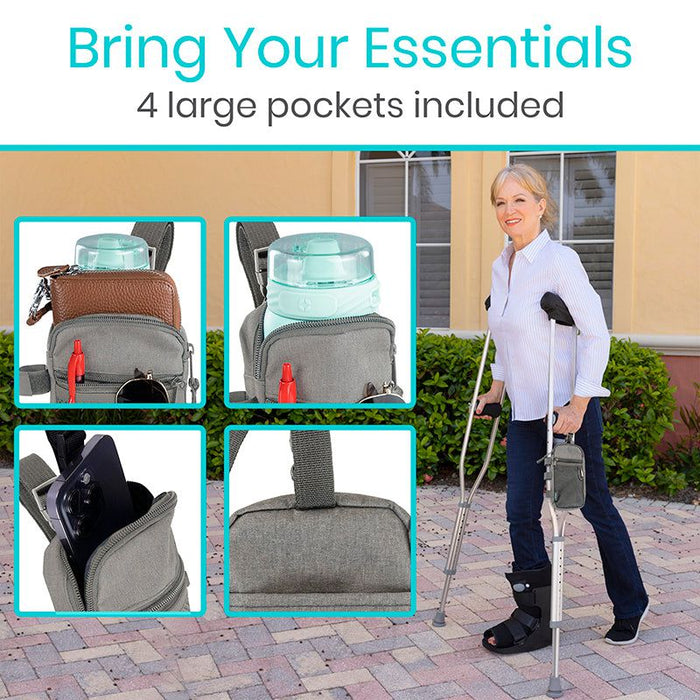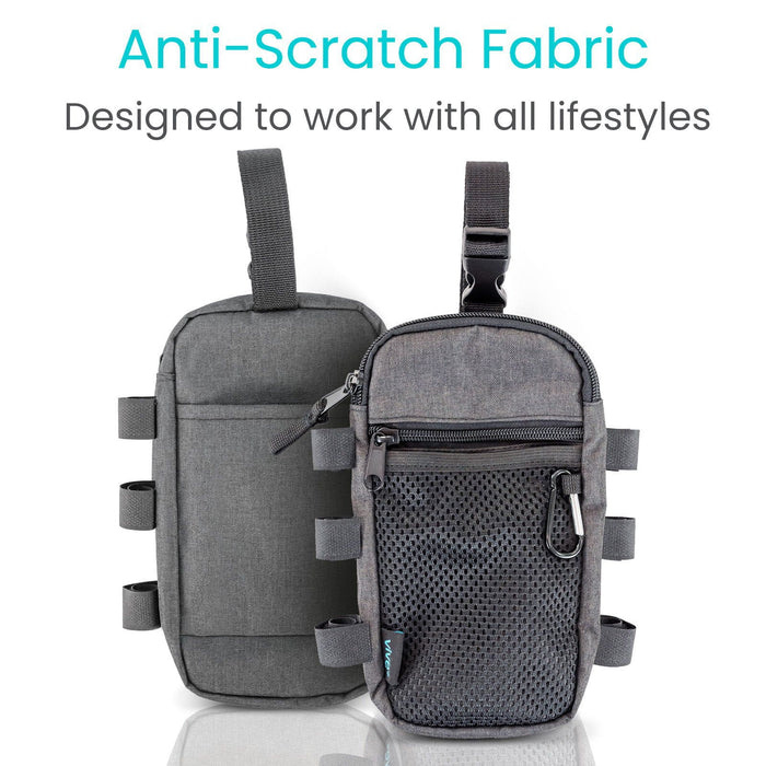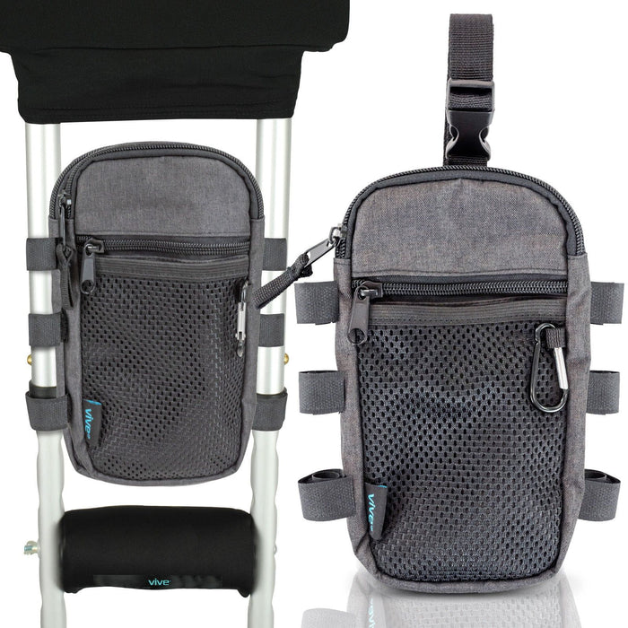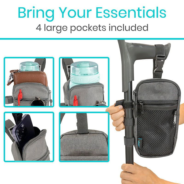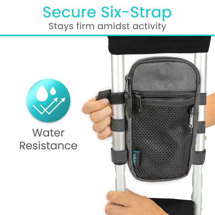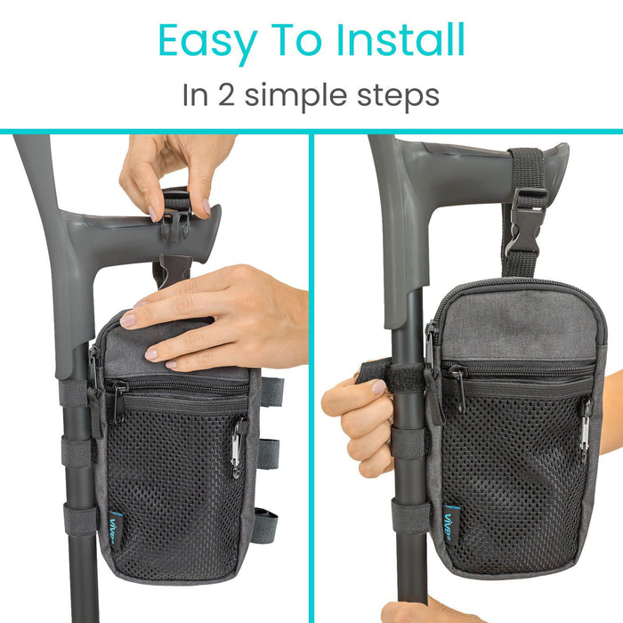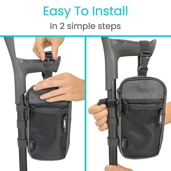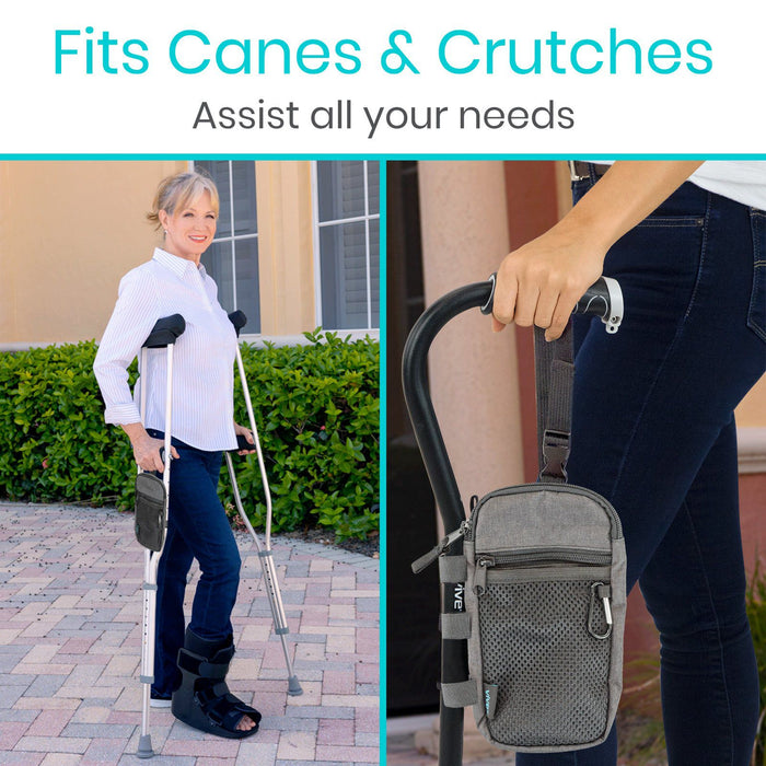 The bag features a non-slip hook and flexible loop straps that allow for easy and secure attachment to a cane or forearm crutches. The straps are also adjustable, for a personalized fit.