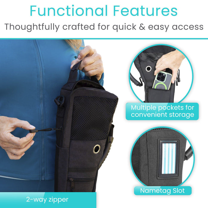 While designed specifically for oxygen tank transport, the compact and spacious design may allow for small essentials like tubing or a keychain.