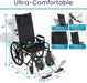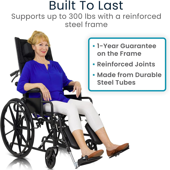 This reclining wheelchair is built with a reinforced steel frame and supports up to 300 pounds, providing long-lasting durability for daily use.