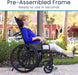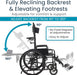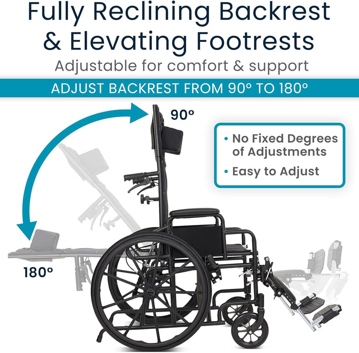 The fully reclining backrest allows users to lay completely flat, providing maximum comfort, pressure relief, and easier patient transfers for caregivers.