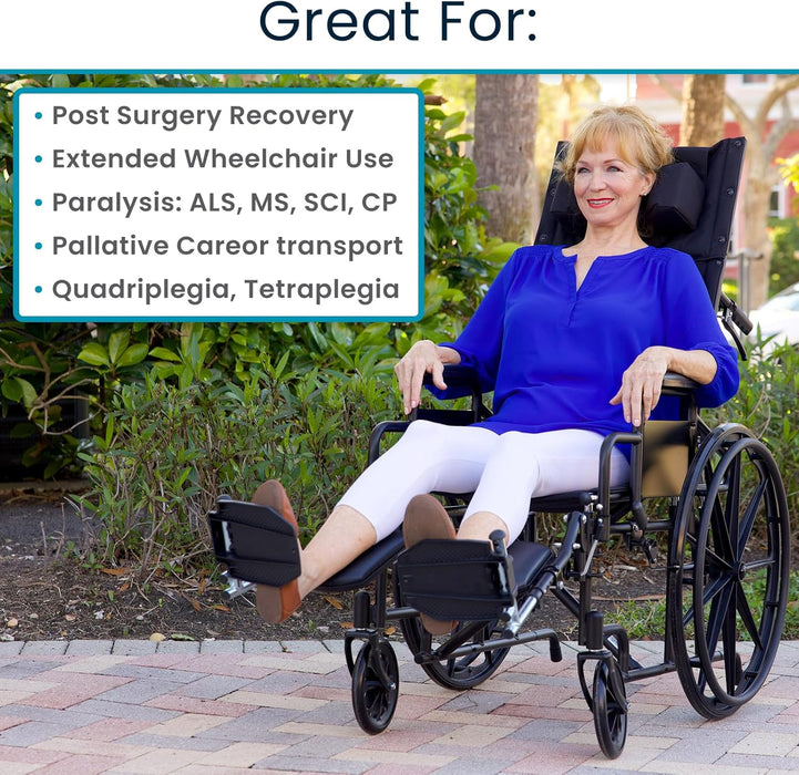 Yes! The wheelchair comes with a built-in cushioned headrest and a stabilizing pad to ensure proper neck and spine alignment, reducing strain while seated or reclined.