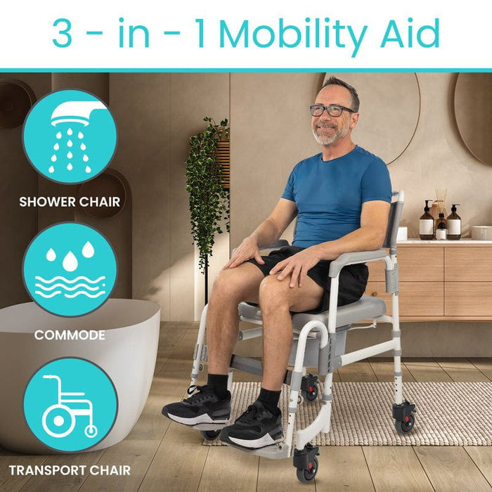 The Vive Shower Commode Transport Chair is a versatile 3-in-1 solution designed to serve as a shower chair, a commode, and a transport chair. This integration facilitates smooth transitions and enhances user independence in various caregiving environments.