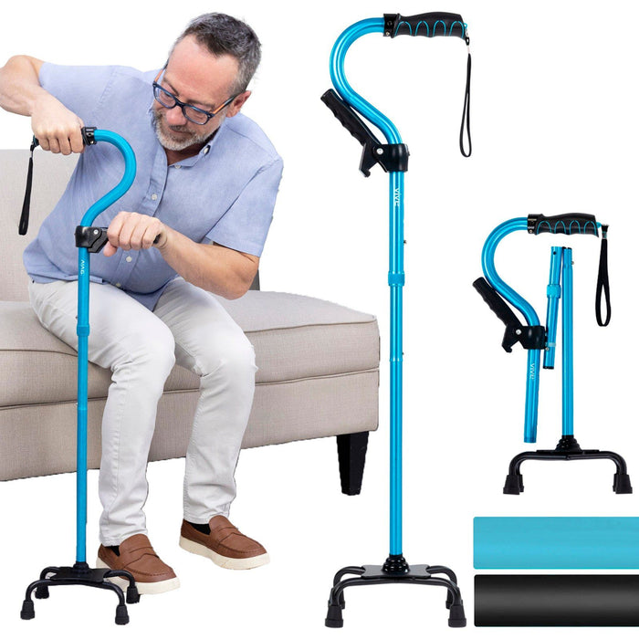 • A normal quad cane that can fold in the middle for storage but also has a drop-down handle to help as a stand assist