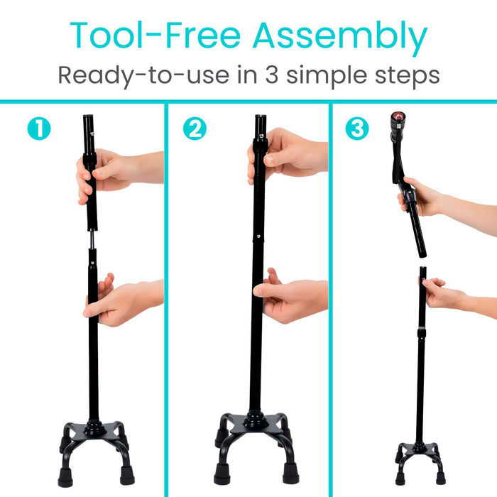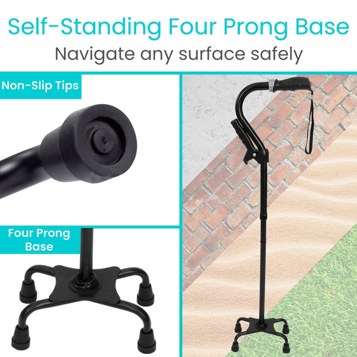 The four-prong base enhances stability, making it easier to balance and providing greater support and mobility assistance. It also ensures the cane can stand independently, keeping it readily accessible.