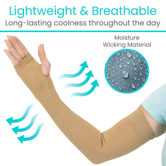 The Vive Arm Protection Sleeves are crafted from a lightweight, breathable, and seamless knit material. This ensures all-day comfort while providing excellent ventilation to keep your skin cool and dry during extended wear.