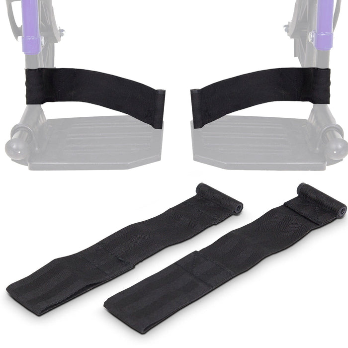 Heel loops attach to wheelchair footrests to keep feet securely in place, preventing slipping or shifting while seated. They provide added stability and support for a safer, more comfortable ride.